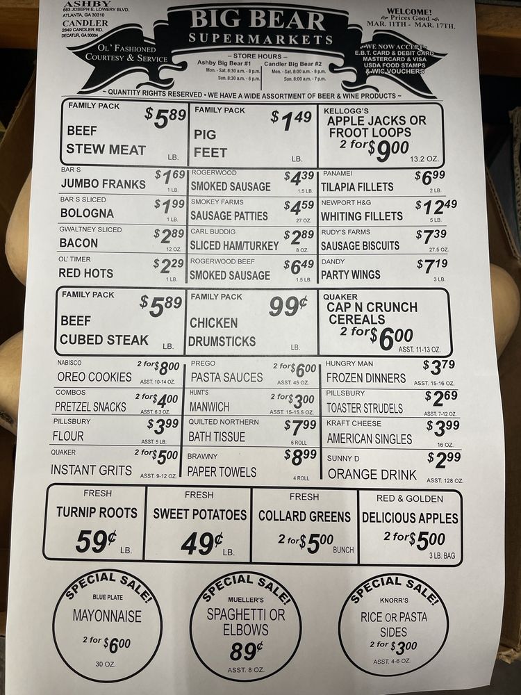 Located in Atlanta, GA, Big Bear Foods is a local supermarket known for its diverse selection and affordable prices. Customers rave about the fresh meats, especially the turkey wings and smoked meats, along with a wide variety of vegetables and fresh herbs. Despite its somewhat old appearance, the store provides a valuable service to the West End neighborhood, offering unique items like 12 pack Faygo colas and DIET Faygo colas that are hard to find elsewhere in Atlanta. While some aspects may need improvement, such as the sketchy meat quality and occasional lackluster customer service, Big Bear Foods remains a reliable option for those seeking fresh produce, reasonable prices, and a convenient location. With a commitment to diversity, equity, and inclusion, this supermarket is a staple in the community and a favorite among loyal patrons.